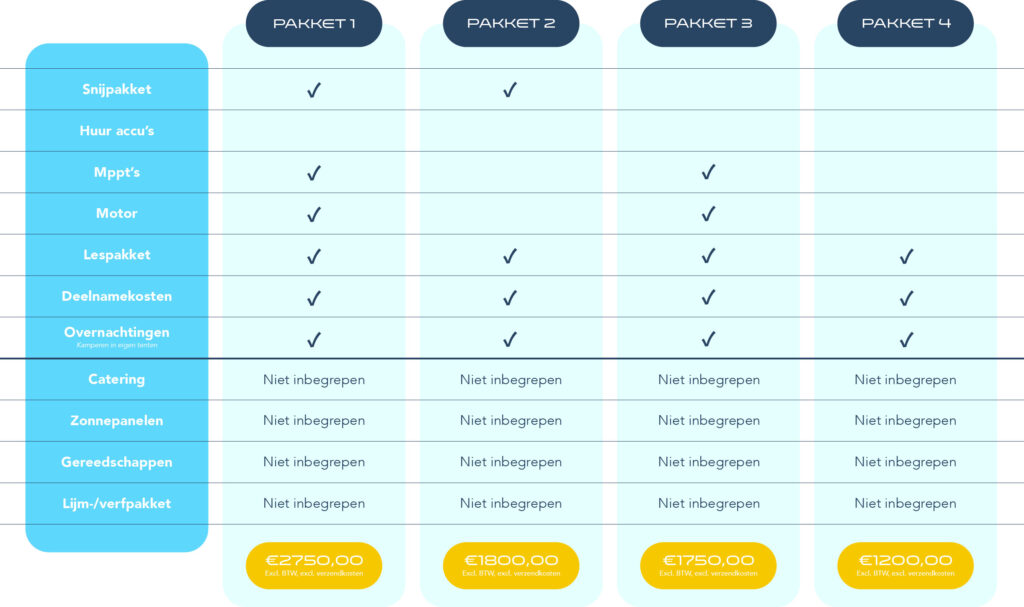 Voor jullie deelname aan de Young Solar Challenge kunnen jullie kiezen uit verschillende pakketten. Elk pakket bestaat uit verschillende onderdelen en heeft daarmee een eigen prijs.